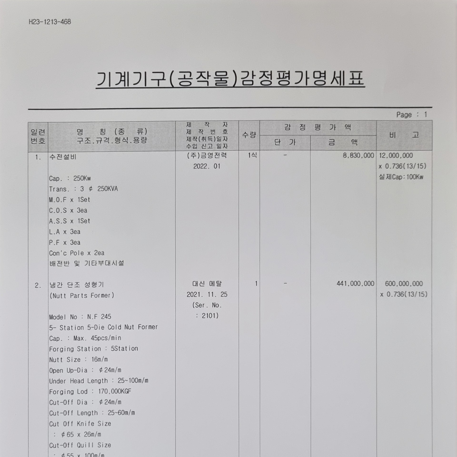 1. 기계 타입 : 냉간 단조 성형기